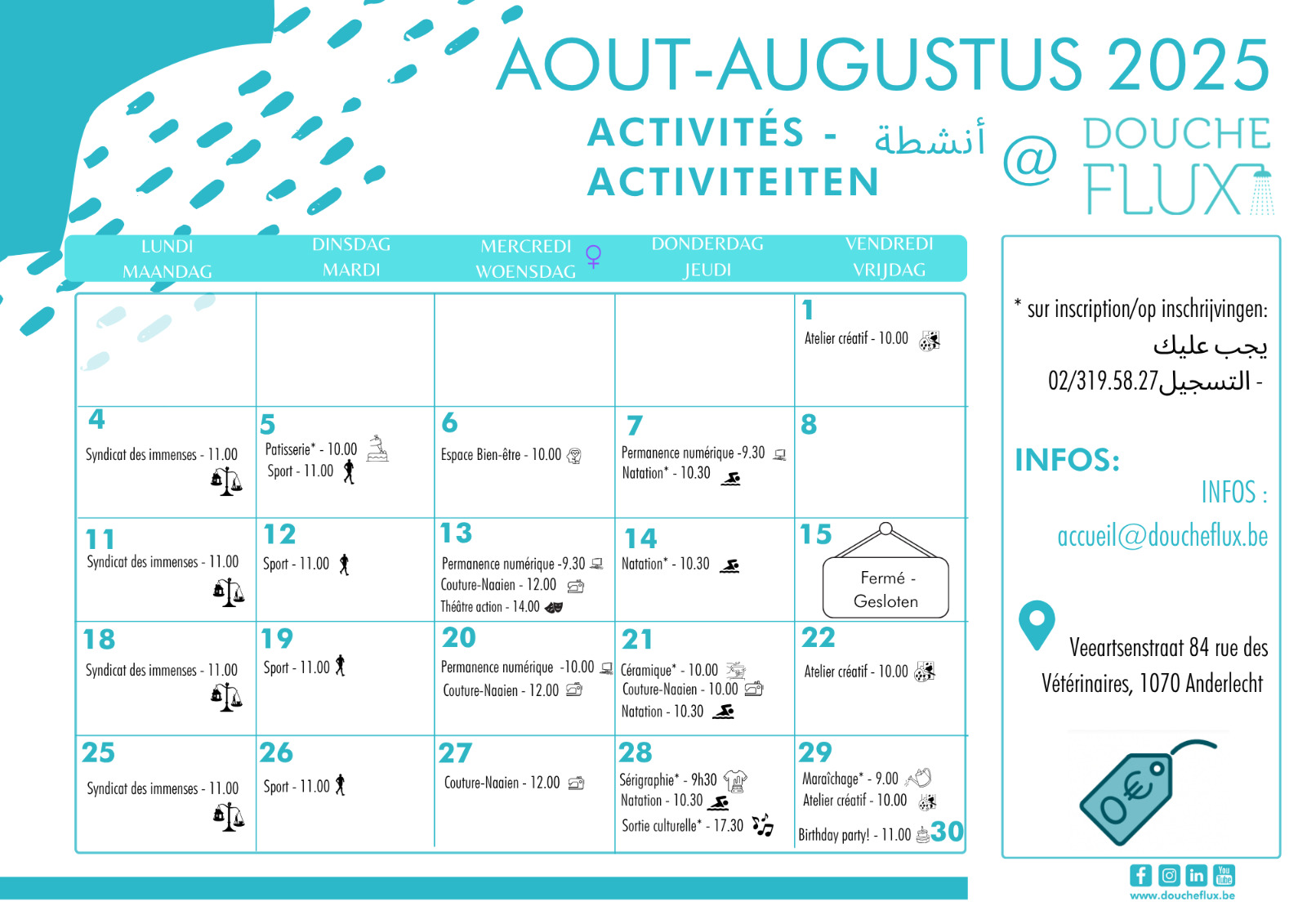 Het doel van de afdeling Activiteiten is om werkzaam te zijn in de hele vereniging. Tal van activiteiten worden aangeboden binnen het dagcentrum van DoucheFLUX zelf. Deze verankering verrijkt de kwaliteit van het onthaal en de omgeving, en maakt zo de geest vrij door de zorgen van alledag buiten beschouwing te laten.